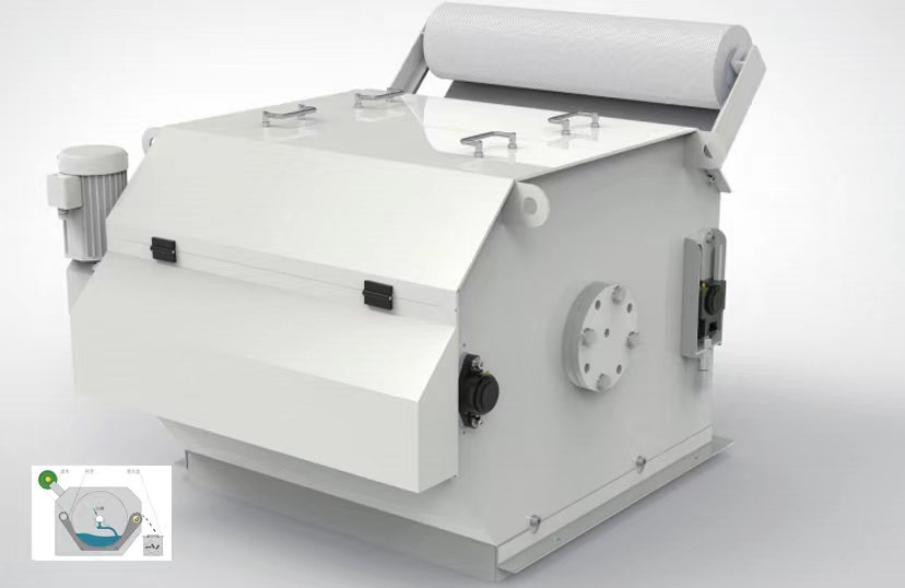 鼓式紙帶過(guò)濾機(jī)由殼體、減速電機(jī)、驅(qū)動(dòng)裝置、篩網(wǎng)總成、密封轉(zhuǎn)鼓、過(guò)濾布、電控系統(tǒng)等部分組成。過(guò)濾布平鋪在篩網(wǎng)總成.上,在密封轉(zhuǎn)鼓的密封下形成一一個(gè)液池。 夾帶雜質(zhì)的切削液經(jīng)緩沖,均勻落到濾布.上。切削液在重力作用下透過(guò)濾布進(jìn)入凈液箱,大于40微米的雜質(zhì)被濾布截留,隨著濾布表面截留的雜質(zhì)不斷累積,表面形成濾餅層,濾餅層也參與過(guò)濾,有效提高切削液的過(guò)濾精度。當(dāng)濾餅層越來(lái)越厚時(shí),切削液的透過(guò)速度逐漸降低,液池內(nèi)液位逐漸升高,當(dāng)液面升高到設(shè)定值時(shí),發(fā)訊機(jī)構(gòu)發(fā)訊,減速電機(jī)驅(qū)動(dòng)篩網(wǎng)總成帶動(dòng)濾布-起運(yùn)動(dòng),走入一段新的濾布,液池內(nèi)的切削液從新走入的濾布透過(guò),液池內(nèi)液位下降,發(fā)訊機(jī)構(gòu)停止發(fā)訊,減速電機(jī)停止運(yùn)轉(zhuǎn),走出的濾布和雜質(zhì)落到廢布盒內(nèi),進(jìn)入下一個(gè)工作環(huán)節(jié)。